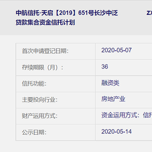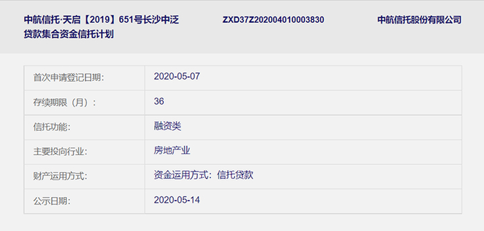 据中国信托登记有限责任公司官网显示,中航651号信托产品于2020年5月首次申请登记,产品存续期间为36个月,主要投向为房地产业。