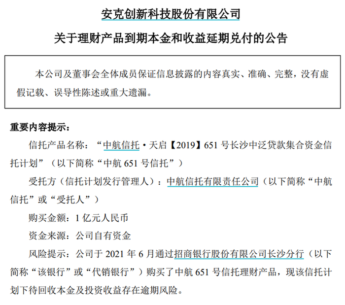 公司此次逾期的中航信托651号产品,是安克创新于2021年6月认购。