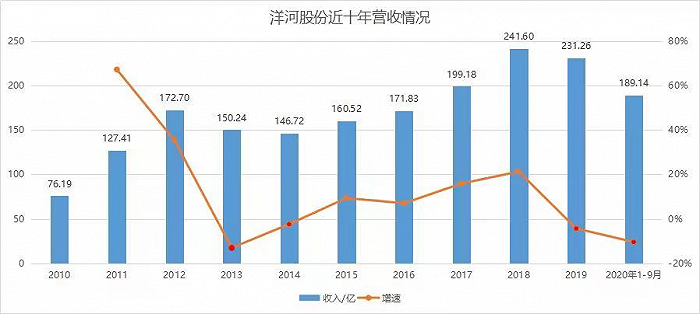值得注意的是,2012年洋河股份营收冲到172亿后,整个行业遭遇塑化剂风波与三公消费受限的冲击,当年公司营收大幅下滑,之后在很长一段时间在相对高位徘徊,增速出现滞长,2018年后甚至开始负增长。因此,不少圈内人感叹,洋河股份蹉跎近10年,错失了白酒业第二个黄金发展周期。