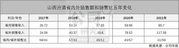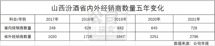 在“2021汾酒全球经销商大会”上,汾酒销售公司总经理李俊透露,汾酒全国亿元市场从2017年的8个增长到了2021年的28个,经销商数量从2017年不足1000家增加到了目前的2944家。2021年,汾酒省外营收首次超过百亿,其中长江以南市场平均增幅60%。