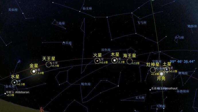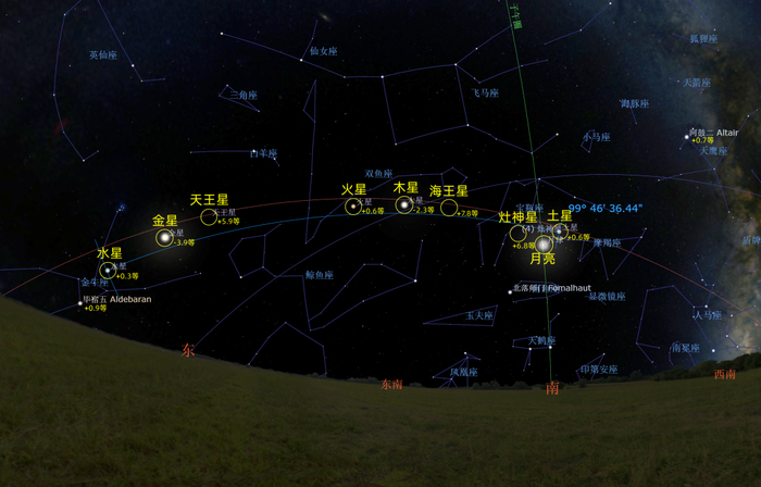 从南方开始,往东方日出的方向看,依次为土星、海王星、木星、火星、天王星、金星和水星。它们的亮度依次是:+0.6等、+7.8等、-2.3等、+0.6等、+5.9等、-3.9等和+0.3等(星等值越小,星星就越亮)。从土星到水星,距离不到100°,肉眼可以完全覆盖,只不过看不见天王星和海王星。施韡说:“如果你有一台望远镜,不仅能看到天王星和海王星,还有机会看到土星东侧的灶神星,它的亮度是+6.8等。”