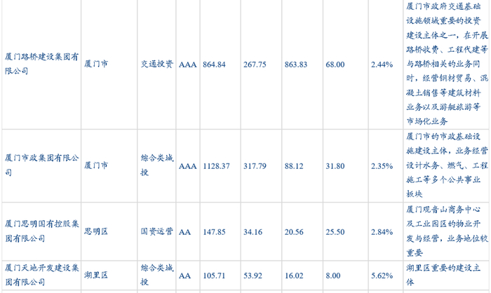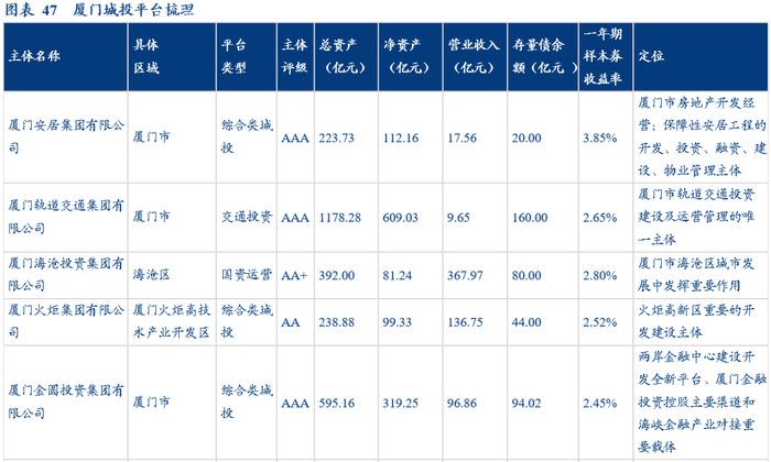 (三)厦门:城投平台少且存量债余额小,信用级别以中高级为主