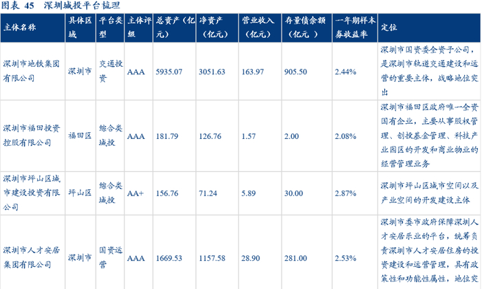 深圳市GDP总量处于绝对领先地位,人均GDP最高,常住人口最多,老龄化人口比率最低。深圳支柱产业为金融业及房地产,中国平安、万科、华侨城等公司实力雄厚。6家城投平台合计有1401.5亿元城投债,其中五家主体评级为AAA,整体信用级别最高。