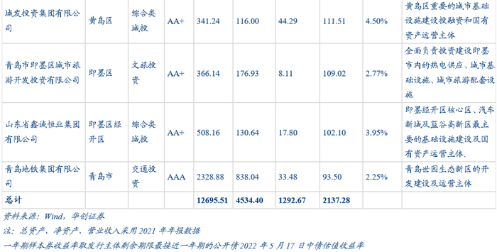 青岛市GDP体量及人均GDP排名第三,城镇和农村常住居民人均可支配收入相对较低。常住人口较多但近三年人口净流入较少,且老龄化人口比率较高。青岛产业链以海尔为核心,兼有银行业、化工、交运、食品饮料,产业结构相对均衡。海尔、海信、澳柯玛等电器公司排名较前。47家城投平台合计有3324.16亿元城投债,一年期平均估值收益率值较高。