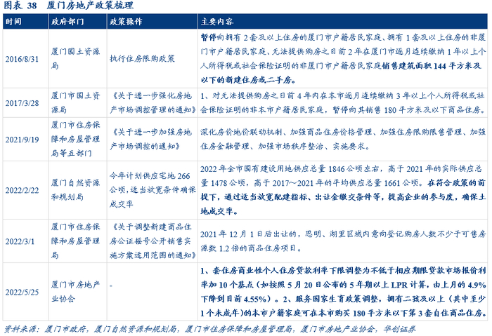 2016-2021年政策调控趋严,2022年政策放松,通过加强预期引导支持商品房市场更好满足购房者合理住房需求。2016年8月厦门市国土资源局发布限购政策,限制三类居民购房。2017年厦门限购令升级,扩大限购人群、执行“认房又认贷”的差别化住房信贷政策。2019年购房条件更加严格,要求厦门户籍居民,成年单身家庭限购一套;两人以上家庭限购两套。非厦门户籍居民限购一套,且需提供买房之日起四年内,连续36个月的纳税或社保证明。2022年以来整个楼市政策发生明显改变,3月厦门住房保障和房屋管理局下发通知,放松购房摇号,表达出明显的政策放松意图。5月24日住建局确认调整限购政策,二孩以上本地户籍家庭可购买第三套房,外地人只需提供半年以上工作证明等资料就可在岛外购房,此前是3年内。