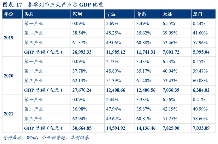大连第一产业占比相对其他城市最高,宁波第二产业占比相对其他城市最高,深圳第三产业占比相对其他城市最高。深圳市第三产业占比高于其他城市,上市公司行业分布主要集中于金融、地产。宁波市第二产业占GDP比重高于其他城市,同时依靠其港口优势提升GDP总量。青岛市第三产业占比最高,其支柱产业有白色家电和汽车配件。大连市近年来经济发展速度较缓,第一产业占比相对其他四市最大,第二产业占GDP比重逐年提升,装备制造和石油化工是大连两大支柱产业。厦门市GDP主要靠第二三产业拉动,主导产业制造业相对突出优势不够明显,产业结构稳定性一般。