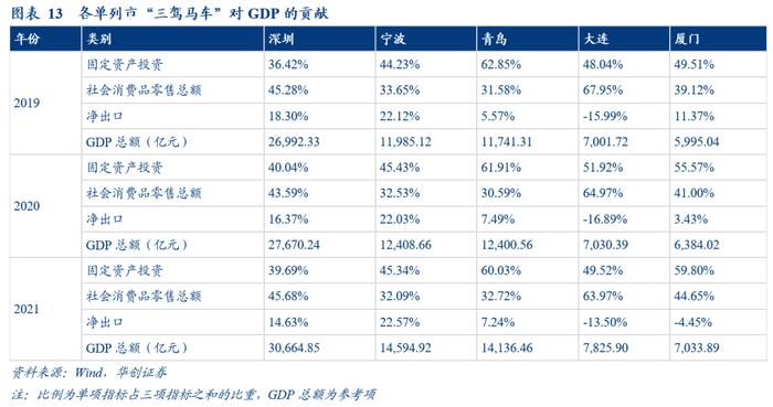 青岛、厦门GDP主要靠投资拉动,深圳、大连GDP中消费占比较高,宁波净出口稳定且在五城中对GDP的贡献度最高。从各指标在在三项指标总额中占比来看,青岛、厦门、宁波固定资产投资所占比重较高,特别是青岛固定资产投资占比超过60%;深圳、大连社会消费品零售总额所占比重最高,其中大连社零占比高于60%;在净出口方面,宁波依靠宁波港净出口对GDP贡献度在五城之中最高。