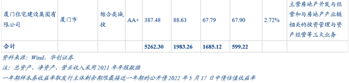 厦门市共有10家城投平台,存量债余额合计599.22亿元,净资产合计1983.26亿元,最近一期共实现营业收入1685.12亿元。其中从平台类型来看,整体公益属性较弱,主要以综合类城投为主,存量债占比44.34%,其次是交通投资类,存量债占比38.05%。发债主体一年期样本债券收益率平均值为3.02%。从信用水平来看,5家平台主体评级为AAA,2家平台主体评级为AA+,3家平台主体评级为AA,信用级别以中高级为主,一年期样本券收益率主体间分化较大。