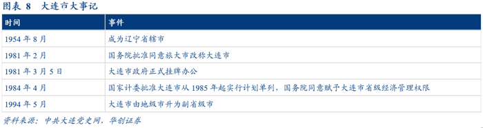 1954年大连市前身旅大市成为辽宁省直辖市,1981年2月正式更名为大连市;1984年7月国家发展计划委员会发布的《国家计委关于重庆市、武汉市、沈阳市、大连市计划单列的通知》中指出,为了进一步开发和建设大连市,充分发挥其口岸城市的作用,批准大连市计划单列,赋予大连市相当省一级经济管理权限。文件要求大连市向国家计委和国务院报送建议数和计划草案;同省、自治区、直辖市一同参加计划会议;向国家计委报送各项计划基数。1994年5月大连市由地级市升为副省级市。