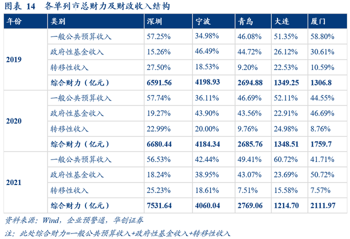深圳总财力高居五市第一,大连总财力居于末位。除厦门财政收入中政府性基金占比较高外,其他城市一般公共预算收入占比较高。从财政收入的结构来看,深圳一般公共预算收入贡献度约为57%,政府性基金收入和转移性收入占比相对较低。近三年宁波一般公共预算收入对财政收入的贡献度持续上升,政府性基金收入占比有所下降。近三年青岛财政收入结构相对稳定,一般公共预算收入贡献较大。大连一般公共预算收入占比明显上升,2021年转移性收入占比有所下降。厦门总财力增速最高,主要是政府性基金收入连续大幅增长所致。
