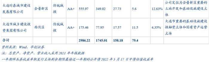 大连市共有6家城投平台,存量债余额合计79.4亿元,净资产合计1745.01亿元,最近一期共实现营业收入1581.18亿元。其中从平台类型来看,整体公益属性较强,主要以公用事业为主,存量债占比70%,其次是传统城投,存量债占比27%。发债主体一年期样本债券收益率平均值为6.58%。从信用水平来看1家平台主体评级为AAA,4家平台主体评级为AA+,1家平台主体评级为AA,整体信用级别较高,一年期样本券收益率均高于4%。