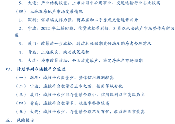 五市土地及房地产市场有产业及人口支撑,韧性较强,整体景气度排序分别为深圳、厦门、宁波、青岛、大连。从楼市来看,2021年底至今,受房地产市场整体不景气影响,虽然五市商品房及二手房成交量有明显下降,二手房价格都比较坚挺,3月以来有明显的回升,随着5月一系列限售、降低房贷利率的救市措施落地,成交量及价格有进一步的保障。土地市场恢复较楼市有所滞后,2022年集中供地成交楼面价均出现较大幅度下降,厦门以两次土拍成交金额共352.35亿元居首,深圳首批供地竞争较激烈,8宗土地以最高限价成交,宁波较为依赖城投公司兜底,青岛、大连恢复较慢,青岛成交总额不足2021年的5%,大连1-4月多宗地块流拍。