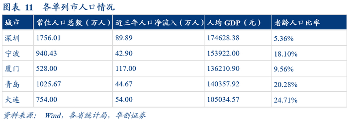人口方面,五大计划单列市近三年常住人口均为净流入,流入较多的深圳、厦门人口结构年轻,流入较少的青岛、大连、宁波老龄人口比例较高。居民收入方面,宁波常住居民人均可支配收入超过深圳位居第一,厦门人均可支配收入增速最快,大连可支配收入最低。
