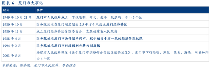 1949年10月厦门市人民政府成立;1989年10月国务院批准设立厦门经济特区;1988年4月18日,国务院发布的《国务院关于厦门市实行计划单列的批复》中指出:厦门市是我国重要的沿海城市,在实行对外开放、发展外向型经济中占有重要地位。为了进一步促进厦门特区经济发展,加快实现沿海经济发展战略,批准厦门市在国家计划中实行单列,赋予其相当于省一级的经济管理权限。1994年2月,国务院批准厦门市行政级别升格为副省级。