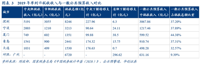 因计划单列市财政收入上解省级财政比例较低,上级下解以中央转移支付收入为主,整体财政自主权更大。在上解省级财政方面,具体来看,2019年深圳对广东省级财政上解141亿元,涉及对省定额上解、国土出让收益计提教育资金上解、地方教育附加上解等科目;宁波从2005年起向浙江省级财政上解,以3亿元为基数,每年环比递增5%;厦门自1994年起,以5.4亿元为基数、以每年9%的增速向福建省上缴财政收入;青岛自2019年起,上解山东省财政资金以30亿元为基数,每年按照青岛市当年财政收入递增上解;大连市专项上解省级财政以2亿元为基数,从2003年起按照全省一般预算收入实际增幅环比递增。对省级财政上解数额及比例较低意味着市级税收收入留用比例较大,计划单列市一般公共预算收入中税收收入占税收总额比重均在30%以上,与广州不足10%对比明显更高,相应地拥有更大的财政自主权。