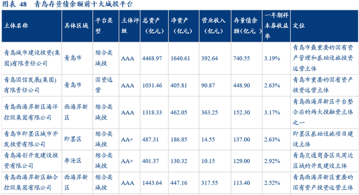 青岛市共有47家城投平台,存量债余额合计3324.16亿元,净资产合计7976.51亿元,最近一期共实现营业收入3161.61亿元。其中从平台类型来看,整体公益属性较强,主要以综合类为主,存量债占比70.24%,其次是国资运营,存量债占比15.99%。前十大发债主体一年期样本债券收益率平均值为3.05%。从信用水平来看,6家平台主体评级为AAA,26家平台主体评级为AA+,11家平台主体评级为AA,信用级别以中低级为主,一年期样本券收益率整体较高。