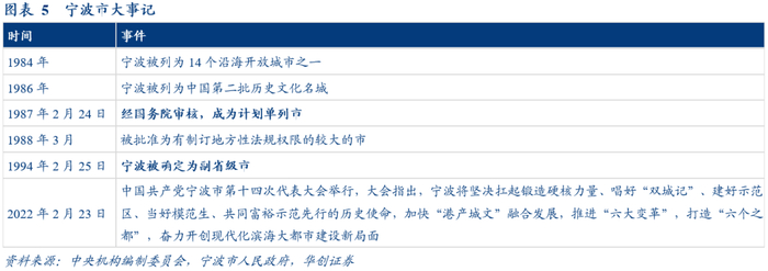 宁波是国家历史文化名城,1984年被列为14个沿海开放城市之一;1987年2月24日,国务院发布《国务院关于宁波市实行计划单列的批复》,指出宁波市是我国对外开放的重要沿海港口城市,在国民经济中的地位正在逐步提高。为了加快对外开放和经济建设的步伐,充分发挥沿海开放港口城市的作用,决定对宁波市在国家计划中实行单列,赋予其相当于省一级的经济管理权限。1994年宁波被确定为副省级市。