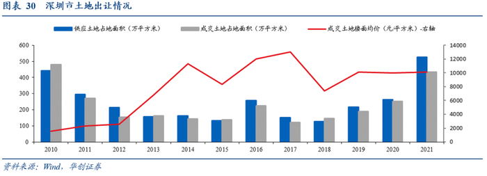 供不应求导致深圳市房价持续上涨,近两年严格政策限制及供应增加导致房市在2020年达到顶峰后持续低迷。2010年之后深圳用于住宅建设的土地出让面积出现断崖式下滑,新房供应少,深圳人口流入量较大,形成严重的供求失衡,导致深圳房价暴涨。2020年7月深圳住建局等部门联合提出8项调控政策抑制房地产市场过热现象。政策发布后二手房市场成交量在7月达到顶峰,之后有明显下降趋势;但新房成交量仍居高不下,新房成交均价也逐步攀升,新房房价和成交量在2021年1月达到顶峰。2021年深圳市加大住宅用地成交面积及新房供应,2月推出的二手房成交参考价使得深圳二手房月度成交量出现持续下滑,新房价格优势及二手房市场遇冷带来了下半年新房成交量的小幅提升。2022年深圳市推出宽松政策稳定市场,2月深圳首套房贷利率由4.95%下调至4.9%,5月进一步下调至4.75%;二套房贷利率由5.25%下调为5.2%,5月进一步下调为5.05%。5月住建局将灵活就业人员等缴存主体纳入,扩宽了公积金缴存主体覆盖范围。