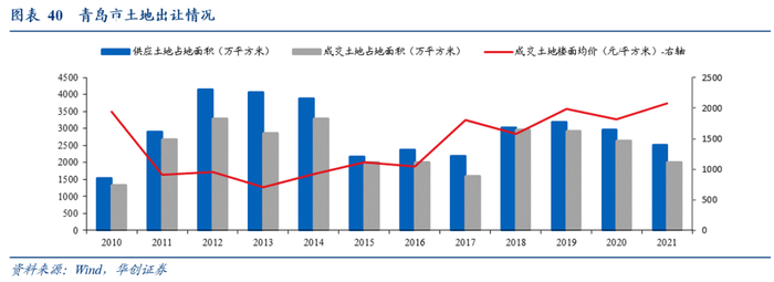 2017年前土地供应较多,成交土地楼面均价上涨幅度较小。2017年发布土地限购政策,楼面价大幅上涨,后续土地供应量上升,但楼面价居高不下。2017年7月土拍市场首次提出“限地价竞自持面积”,9月首次提出“竞自持租赁住房面积”。2017年青岛市供地面积同比下降20.9%,主城区土地资源稀缺,市场需求外溢,整体土地市场处于高热状态,成交土地楼面价大幅上涨。2022年第一次土拍以29.5亿成交15宗地块,数量相较2021年有明显减少,12宗底价成交,最高溢价率13%,成交总额不足2021年的5%,拿地房企以央企、国企、地方平台公司为主。