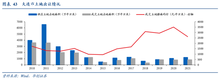 2016年商品房销售量增加带来了土地市场的活跃,2018年土地楼面均价大幅提升,2021年伴随土地供应面积增大,楼面均价有所下滑。2016年商品房销售和存量房消化的回暖极大刺激了土地供应市场,土地供应市场呈现出较大需求空间,2016年的土地市场较为活跃,成交土地楼面价格也小幅上升。2018年上半年大连土地市场供应收紧,开发商竞争激烈,成交土地楼面均价也被抬升。之后政府颁布限购、限价等政策,成交土地楼面均价震荡下行。2021年下半年起土地供应面积上升,土地成交面积上升,成交土地楼面均价小幅下滑。2022年大连土地市场恢复较慢,前三次土拍全部流拍,一季度土地挂牌83.53万㎡,环比上涨35%;摘牌30.01万平,环比下降47%,同比下降71%,季度土地成交楼面价也大幅下降。