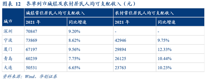 宁波常住居民人均可支配收入最高,厦门人均可支配收入增速最快,大连人均可支配收入最低。五市之中,宁波无论是城镇还是农村居民人均可支配收入均排名第一。大连城镇常住居民人均可支配收入最少,增速也最低;农村常住居民人均可支配收入最少,增速也较低。
