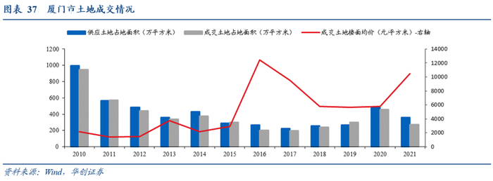 土地供求基本平衡,2022年土地供应增加,楼面均价小幅下降。2013年以来厦门市土地供应量与成交量基本保持平衡,也使得厦门市土地楼面均价没有大幅波动。2016年厦门市减少了土地总供应量,提高竞地门槛,并采用“限地价、竞配建”方式拍卖出让,集美、翔安等地相继拍出极高价格的土地导致2016年成交土地楼面价大幅上涨。后续加强了房地产金融监管力度,采取措施稳定土地市场,有效抑制了土地成交楼面地价过高上涨。2020年加大土地供应,成交量也有所上升。2021年厦门市经营性用地出让面积下降50%,成交总价同比上升29%。2022年厦门两次集中供地以352.35亿元出让18宗地块,无流拍但均价同比有所下降。
