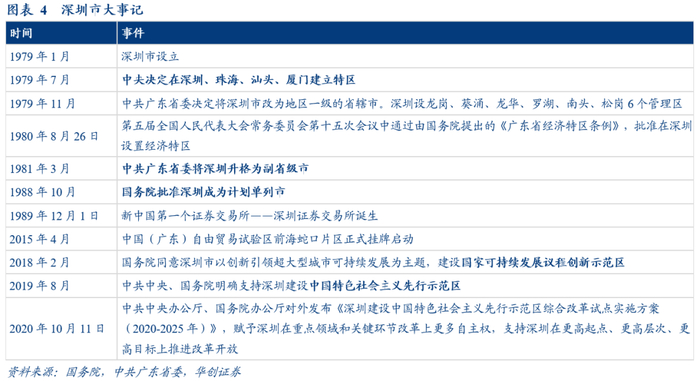 深圳市于1979年1月设立,11月广东省将深圳市改为地区一级的直辖市;1980年8月深圳被批准设置经济特区;1988年10月3日国务院发布的《国务院关于深圳市在国家计划中实行单列的批复》中指出:深圳市是我国的经济特区,在实行对外开放、发展外向型经济中占有重要地位。为了进一步促进深圳特区经济开放, 加快实施沿海经济发展战略,同意深圳市在国家计划中实行单列, 并赋予其相当于省一级的经济管理权限。1989年12月深圳证交所成立;2015年中国(广东)自由贸易试验区前海蛇口片区正式挂牌启动。2019年中共中央、国务院明确支持深圳建立中国特色社会主义先行示范区。