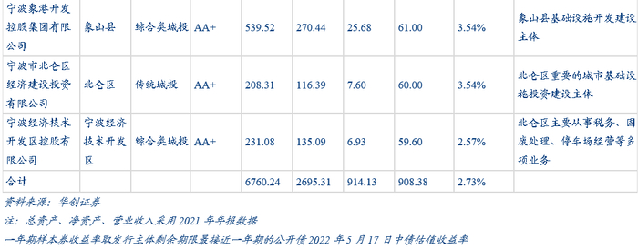 宁波市GDP体量及人均GDP排名第二,城镇和农村常住居民人均可支配收入最高。常住人口及近三年人口净流入较少,但老龄化人口比率较高。产业分布相对均衡,上市公司行业分布银行、交运、汽车、地产占比较高,宁波舟山港吞吐量全球第一。60家城投平台合计有2060.75亿元城投债,一年期平均估值收益率值相对较高。