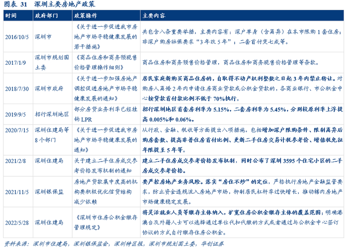 2016年以来深圳楼市政策逐步收紧,2021年末政策逐渐松动,土地及房屋供应量提升。深圳是近年来全国房地产调控最严厉的城市,2016年首次提出房住不炒,非深户社保年限1改3,再改5;有房贷首付5成。2017年颁布预现售价格限定政策。2018年7月31日宣布新房、二手房限售3年,商务公寓限售5年,限制离婚买房等一系列政策。2021年二手房参考价政策直接让深圳楼市进入“冰冻期”,房地产和楼市依旧延续相对低迷的格局,市场压力较大。今年以来国家释放出房地产政策放松的积极信号,虽然深圳二手房参考价等重大政策尚未出现调整,但部分可以活跃的楼市政策已经出现松动。例如5月部分银行首套房贷利率从4.9%降至4.75%,二套房贷利率从5.2%降至5.05%。