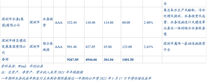 深圳市共有6家城投平台,存量债余额合计1401.5亿元,净资产合计4944.66亿元,最近一期共实现营业收入361.04亿元。其中从平台类型来看,整体公益属性较弱,主要以交通投资类为主,存量债占比64.61%,其次是国资运营,存量债占比20.05%。发债主体一年期样本债券收益率平均值为2.46%。从信用水平来看,5家平台主体评级为AAA,1家平台主体评级为AA+,整体信用级别较高,一年期到期收益率水平最低。