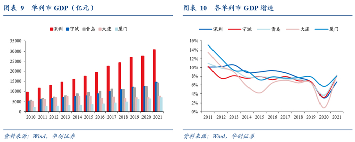 深圳经济总量遥遥领先、宁波和青岛处于第二梯队,厦门和大连体量较小。2019年至今厦门GDP增速最高,深圳GDP增速近三年下降幅度较大,2021年在五市中GDP增速最低。大连GDP体量及增速整体位于五市之末,由于2020年的低基数,2021年GDP增速超过深圳,宁波和青岛GDP总量和增速居中。