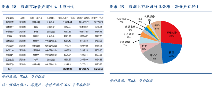 深圳上市公司行业分布主要集中于金融、地产,作为华南地区的金融中心具有特殊地位。从净资产口径判断,深圳市上市公司主要分布于金融行业和地产行业,金融业占比接近50%,房地产行业公司占比18%。金融业中,中国平安是深圳第一大企业,在保险行业的市场规模仅次于中国人寿。房地产企业中,万科在房地产开发企业中综合实力排名第一,华侨城集团如今已经跻身全球主题公园集团三强,稳居亚洲第一。此外,深圳高新技术行业企业规模庞大,比较典型的有腾讯、华为等,整体经济活力较强。