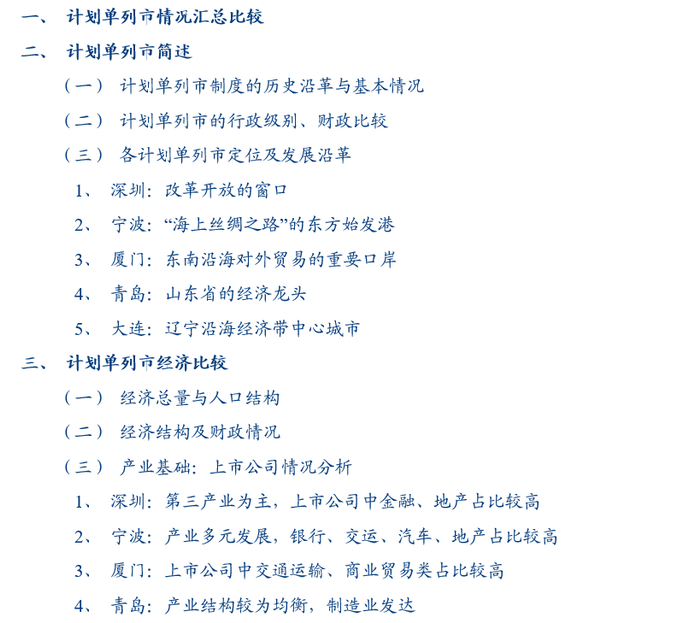 “计划单列市”全称为“国家社会与经济发展计划单列市”,是计划经济体制下的一种制度安排。最早一批计划单列市设置于20世纪50年代,我国一共调整过4次计划单列市,1954-1958年对沈阳、武汉、广州、重庆、西安等实行国家计划单列体制;第二次调整出现于20世纪60年代,将哈尔滨列为计划单列市;20世纪80年代设立重庆、深圳等在内的第三批计划单列市,1993年的第四次计划单列市调整中,中央取消了省会城市的计划单列,1997年,重庆改为直辖市,保留了大连、青岛、宁波、厦门、深圳等5个计划单列市。