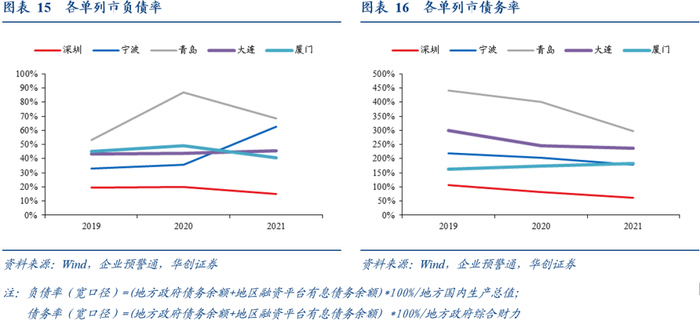 地区间负债不均衡,青岛市经济发展对政府举债依赖程度较高,经济最发达的深圳负债率和债务率最低。2020年新冠疫情冲击下,政府信用放宽,特别是城投债在低利率环境和基建加码的带动下发行量显著提升,加之GDP增速下降,五市负债率均有所上升,其中青岛市负债率增幅最大,虽2021年有所下降,但在五市之中仍居于首位。大连、厦门财政收入较低,导致其政府债务率相对较高。深圳经济发达,社会资本活跃,高财政收入和高GDP的情况下可以保持政府低债务率和低负债率,偿债压力也最小,且2021年深圳市在五市之中是唯一一个债务率低于100%的城市。
