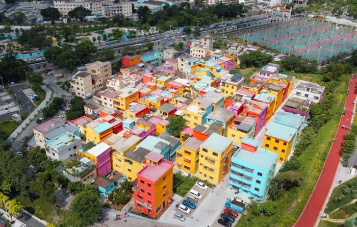 “彩虹村”结合儿童公园项目对外开放使用。近年来,江海区对横坑村实施微改造工程,统一使用环保原料,将全村居民楼刷成黄、橙、天蓝、浅绿色等各种颜色,远远看上去仿佛是一幅五彩斑斓的油画,由此得名“彩虹村”。横坑村是江门新晋网红打卡点,红、橙、黄、绿、青、蓝、紫各色混搭,这里被粉刷得像是一个小型的童话王国,走进村子,随便一站都犹如定格在画里一般,大片分分钟不在话下。