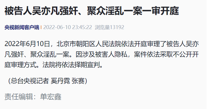 2022年6月10日,北京市朝阳区人民法院依法开庭审理了被告人吴亦凡强奸、聚众淫乱一案。因涉及被害人隐私,案件依法采取不公开开庭审理方式。法院将依法择期宣判。