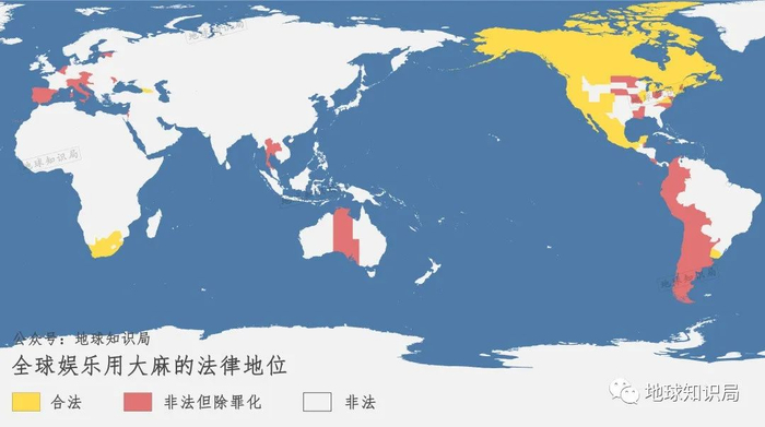 截至目前,世界上已经有包括乌拉圭、加拿大、格鲁吉亚、马耳他、墨西哥、南非和美国的19个州在内的国家和地区在法律层面上宣布娱乐用大麻合法化,阿根廷、英国、法国、意大利、德国等44个国家和地区宣布医疗用大麻合法化。