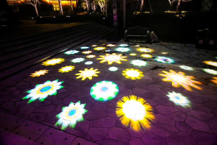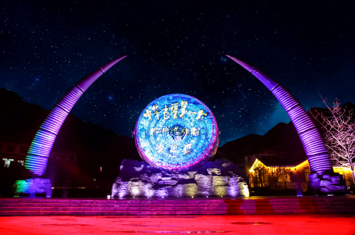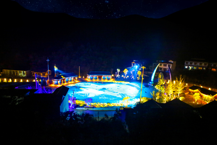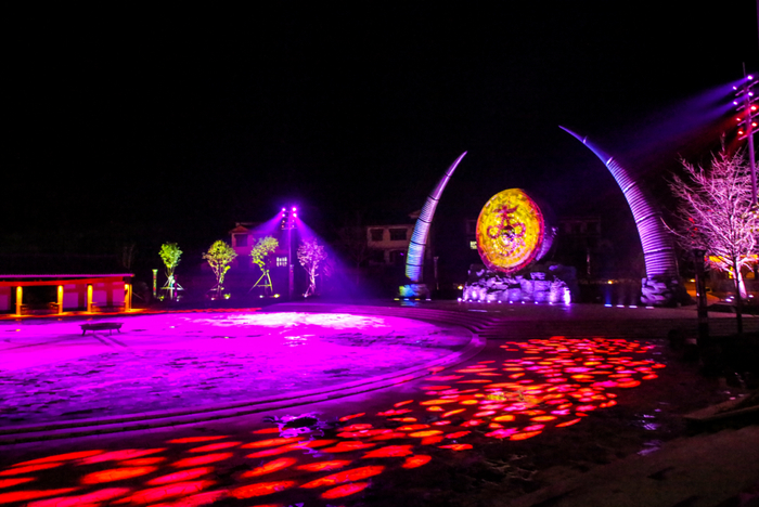 遥望千年广场上有热闹的歌舞表演和绝妙灯光秀,