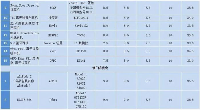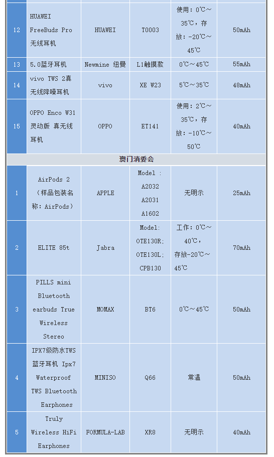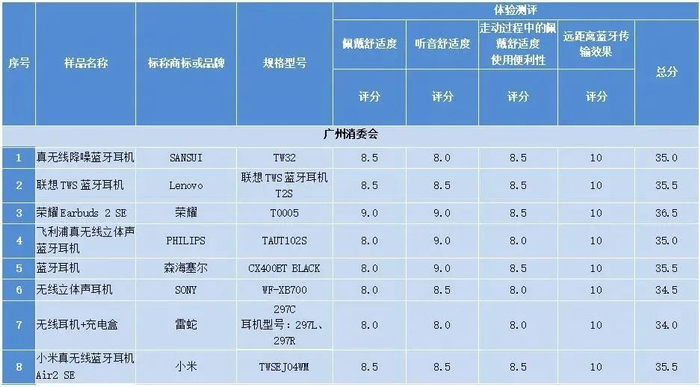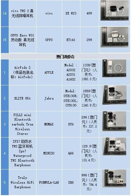 此前,广州市消委会、澳门消委会共同委托广州质量监督检测研究院对目前市面常见品牌的蓝牙耳机开展了比较试验。
