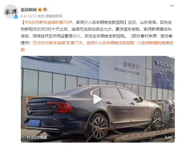 据澎湃新闻报道,山东菏泽的田先生购买的一辆沃尔沃S90新车,十天之后出现连续无法启动多达七次,要求4S店退车,被对方以不符合汽车三包政策规定为由拒绝。随后,菏泽经开区市场监管局介入处理,最终田先生的车辆被4S店以“员工回购”名义全款回购。
