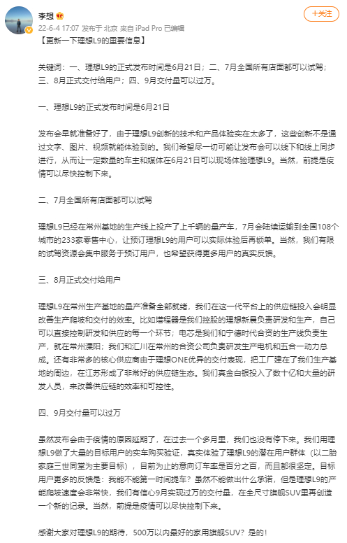 理想第二款车型有最新消息。据理想汽车CEO李想在微博透露,理想L9将于6月21日正式发布,到了7月全国所有店面都可以试驾,8月可以将新车正式向用户交付。此外,李想还表示到了9月理想L9销量就会过万。对于理想L9是否为“500万以内最好的家用旗舰SUV?”,李想给出“是的”回答。