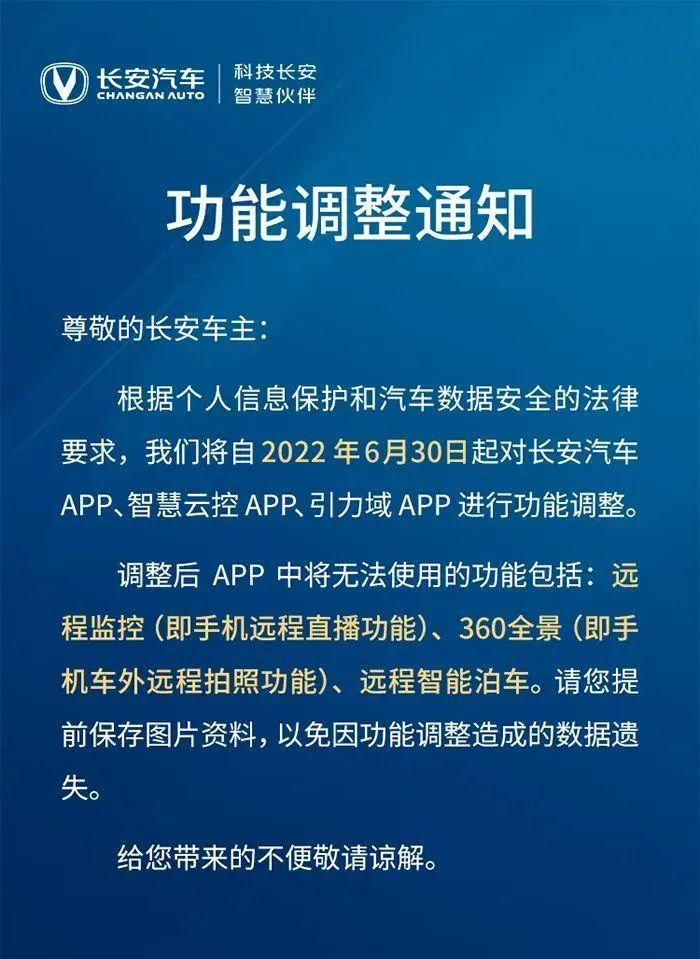 近日,长安汽车发布公告,根据个人信息保护和汽车数据安全的法律要求,将自2022年6 月30日起对长安汽车App、智慧云控App、引力域App进行功能调整。调整后App中将无法使用的功能包括:远程监控(即手机远程直播功能)、360全景(即手机车外远程拍照功能)、远程智能泊车。