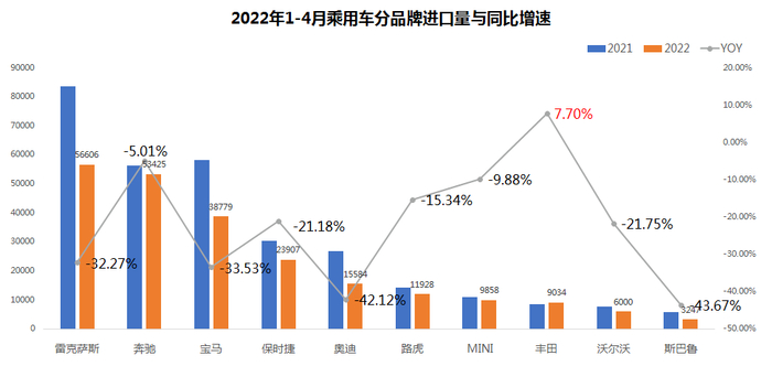 6月6日,中国汽车流通协会发布《2022年4月中国进口汽车市场情况分析》报告。报告显示,在前十大进口车品牌中,雷克萨斯依旧保持第一,奔驰、宝马分别位居二三名,其中奔驰进口53425辆,宝马进口38779辆。