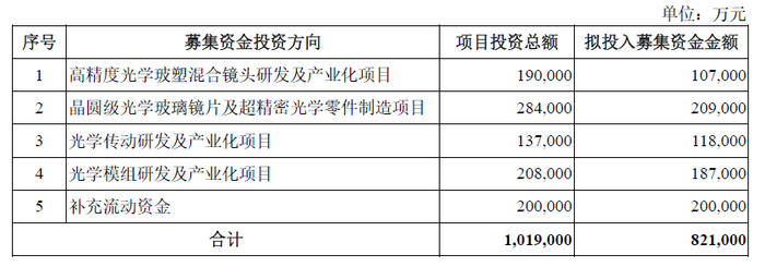 此次诚瑞光学IPO拟募资82.1亿元,分别用于高精度光学玻塑混合镜头研发及产业化项目、晶圆级光学玻璃镜片及超精密光学零件制造项目、光学传动研发及产业化项目、光学模组研发及产业化项目和补充流动资金。