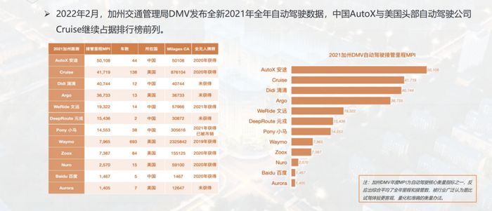 两年前,很多中国企业已经把测试重心放在国内,这个数据的可参考性就更小了;另外很重要的一点,截止2022年2月,谷歌 Waymo 的总测试里程数超230万英里,而 AutoX 仅5万英里,这里的数据仅仅是MPI数据。