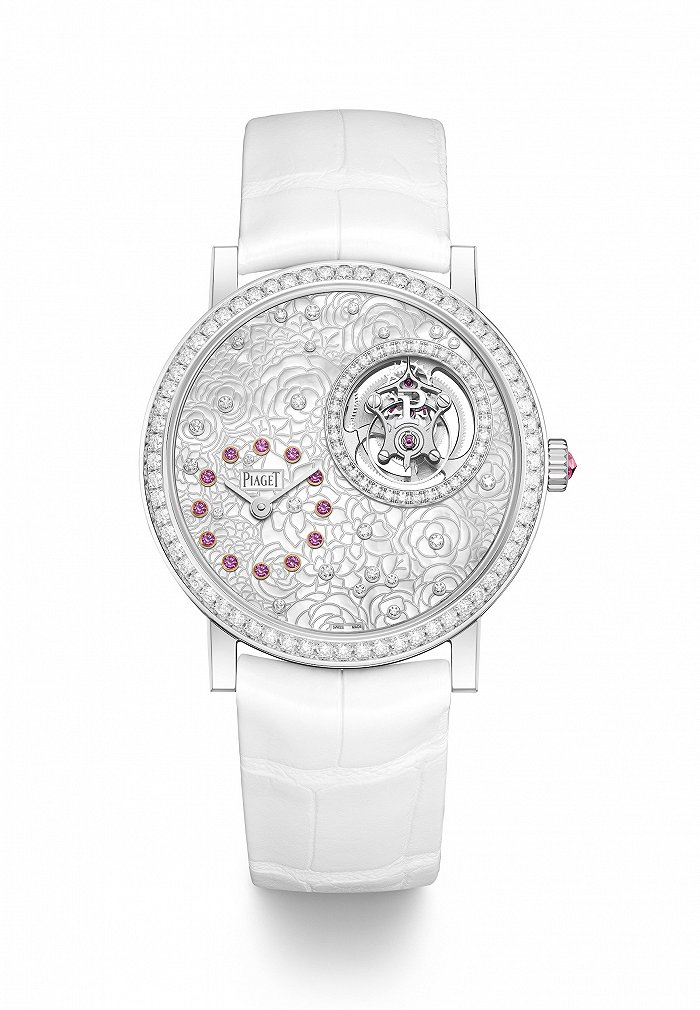 PIAGET伯爵Rose系列全新推出一款时计作品,选取玫瑰元素,致敬伯爵家族传人Yves Piaget。这款腕表采用18K白金打造,以精致华美的花卉雕饰,诠释惊艳创意与巧妙设计。工匠大师选用真正的玫瑰花瓣来打造表带,并历经两年多,将这条极具创意的玫瑰表带最终呈现。表盘直径38毫米,搭载伯爵自制超薄手动上链机械670P飞行陀飞轮机芯,动力储存48小时。表圈镶饰64颗明亮式切割美钻、表冠镶1颗明亮式切割粉色蓝宝石、珍珠母贝雕花表盘,镶饰5 颗明亮式切割美钻。表达出华美经典,又具有时尚品味的美学理念。