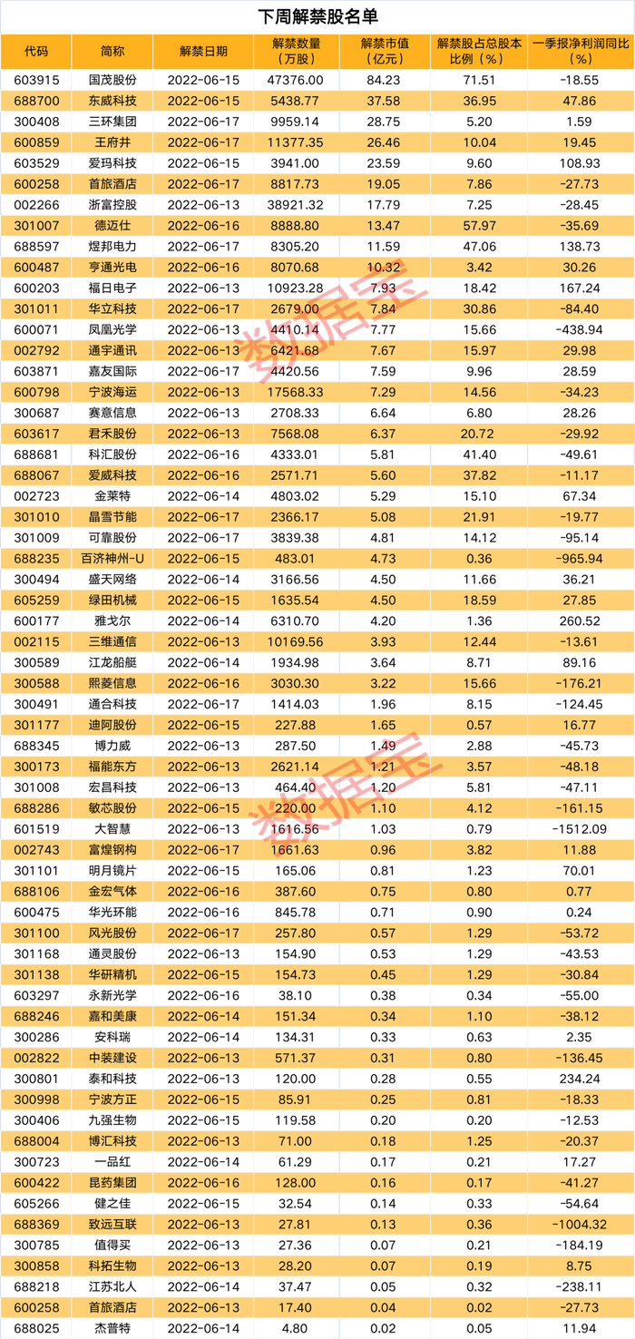 下周将有62只股解禁,按照最新收盘价计算,合计解禁市值404.79亿元。