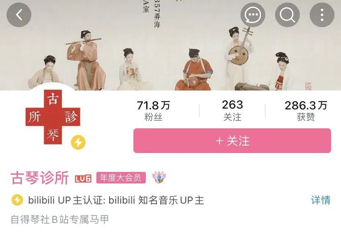 在B站上使用“古琴诊所”这一账号吸引了七十多万粉丝。