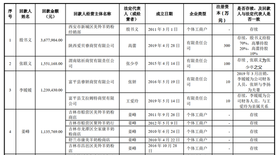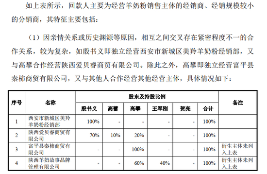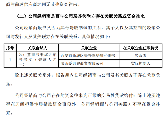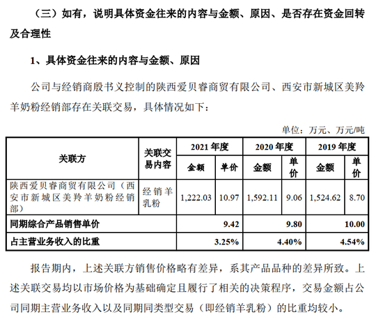 陕西爱贝睿商贸有限公司(西安市新城区美羚羊奶粉经销部)已与发行人合作多年且交易稳定、信用良好。该关联交易为销售羊奶粉所产生的销售收入,且关联交易定价公允、决策程序合法合规、存续时间较长,不存在资金回转的情形。