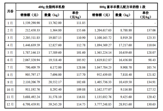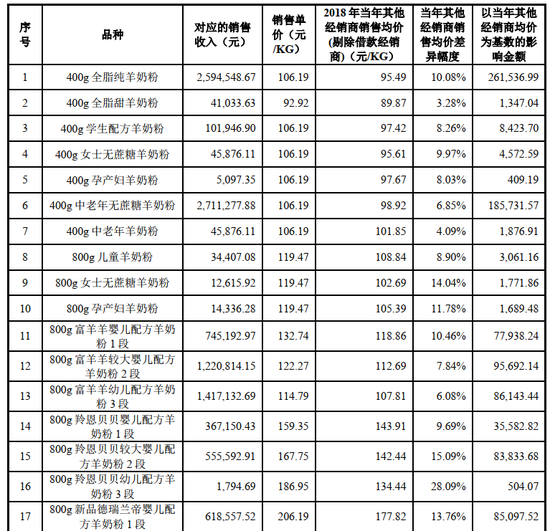 由于公司产品销售存在搭赠以及搭赠幅度不同的情况, 因此, 一般情况下公司各品种每年的销售价格范围在当年销售均价上下 20%幅度内波动,如上述列示的 400g 全脂纯羊乳粉、 800g 富羊羊婴儿配方羊乳粉 1 段等等。小听粉由于搭赠与否的幅度更大且存在无偿赠送的情况,因此其波动幅度较大。